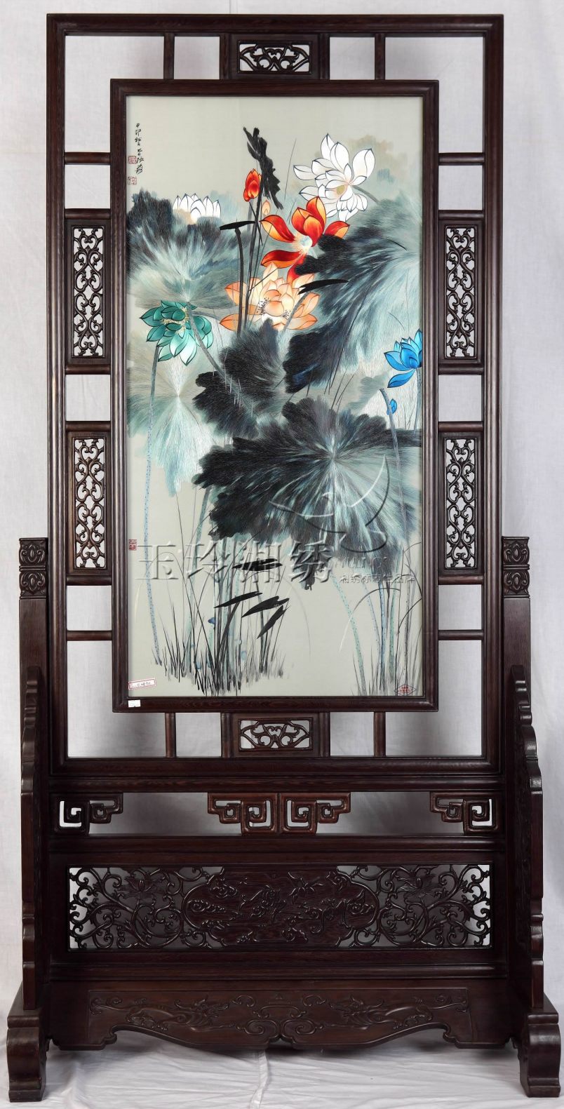 雙面雕花座屏 水墨荷花